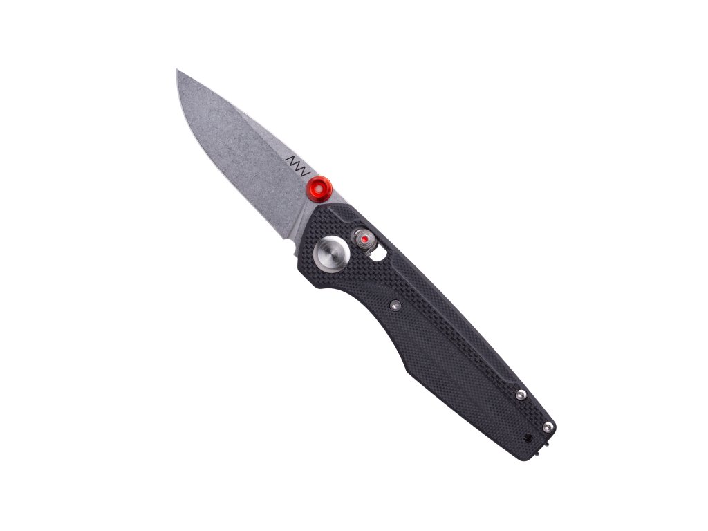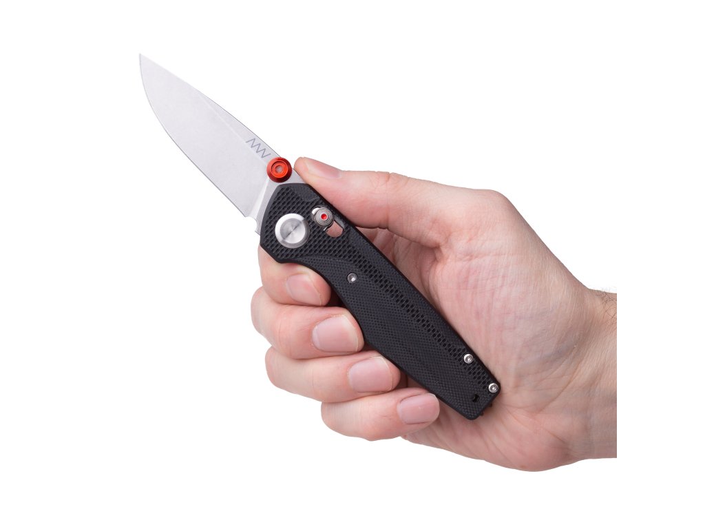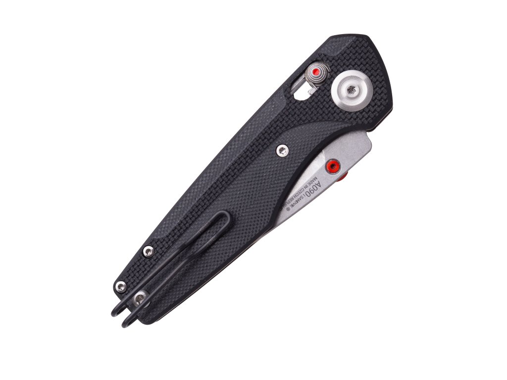 Inspiré de la construction du modèle A200, il conserve tous les éléments fonctionnels essentiels. L’ouverture à une main est assurée par un thumb stud ambidextre rouge avec ANV lumidot intégré. La lame se déploie avec fluidité grâce aux roulements à billes, tandis que le mécanisme de verrouillage fiable A-lock garantit une sécurité optimale. Les plaquettes ergonomiques en G10 noir, dotées d’une texture usinée avec précision, offrent une prise en main sûre sans être excessivement agressive — idéale même lors d’une utilisation prolongée.